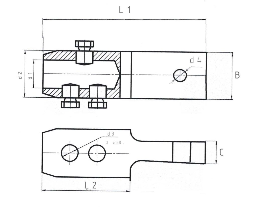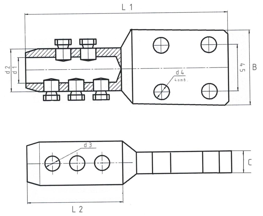 Дюралеві кабельні наконечники, що закріплюються болтами зі зривною головкою, призначені для проводів та кабелів з алюмінієвими жилами Перетином від 10 до 1000 мм2 та напругою до 35 кВ.